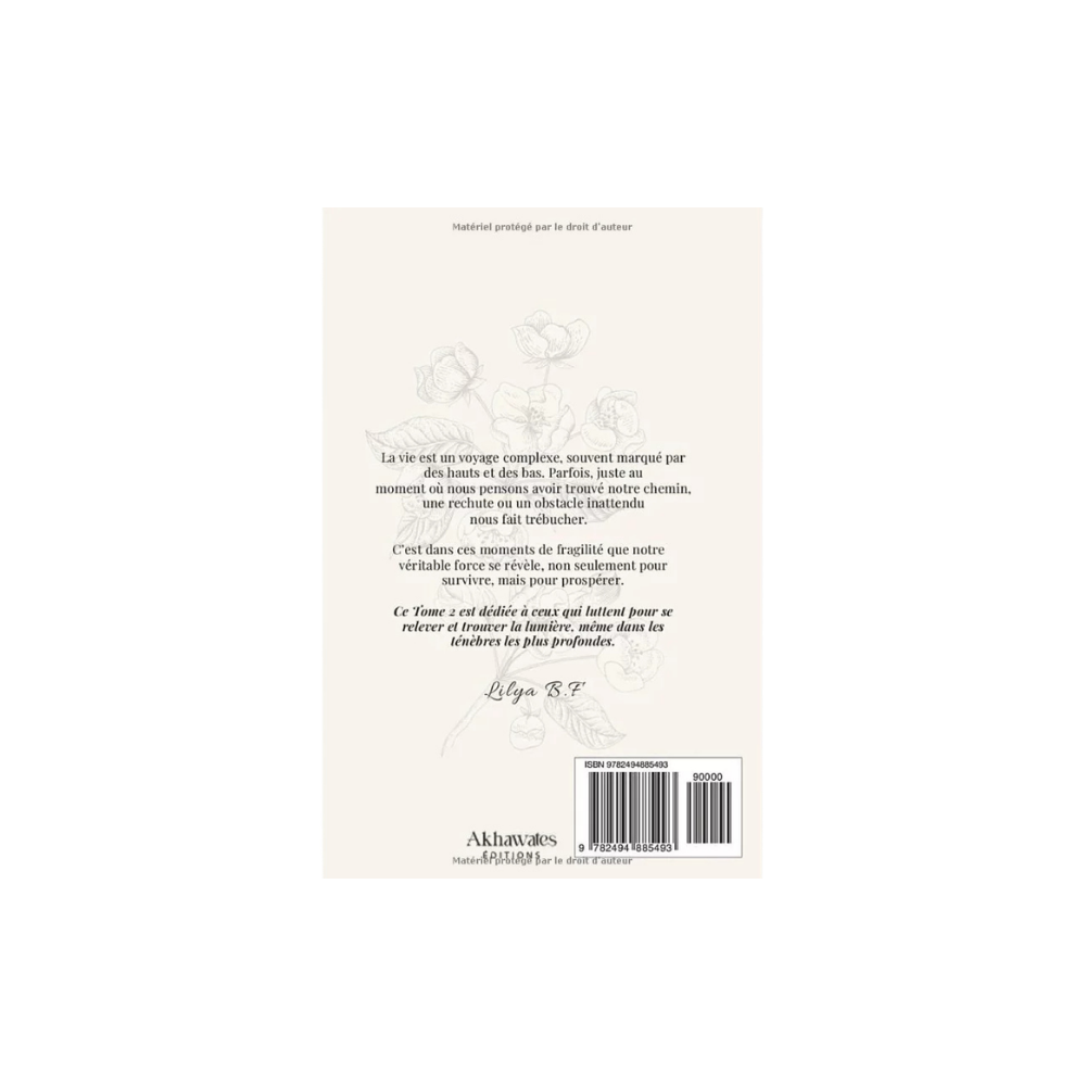 La vie est faite de hauts et de bas. Dans ce tome 2, Lilya B.F s’adresse à toutes les âmes fragilisées par les épreuves, les doutes ou les blessures invisibles. À travers une écriture douce, sincère et réconfortante, l’auteure invite à transformer la chute en renaissance.