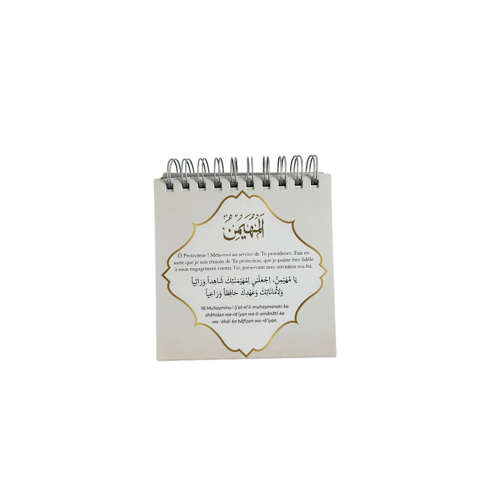 Grâce à son format chevalet à spirale, il est facile à manipuler et agréable à consulter jour après jour. Il invite à renforcer sa relation avec Allah, à méditer Ses Noms et à les intégrer dans sa vie quotidienne.