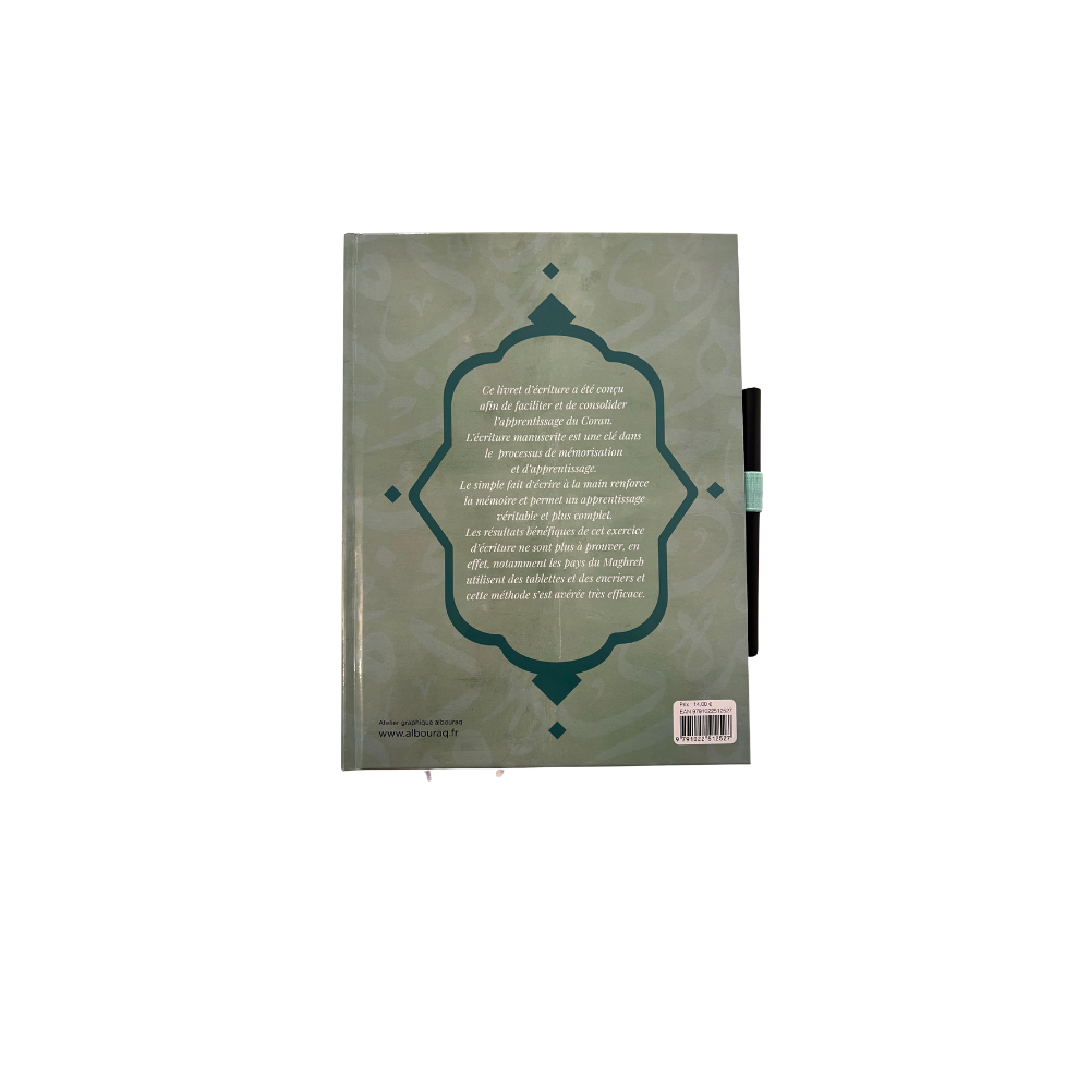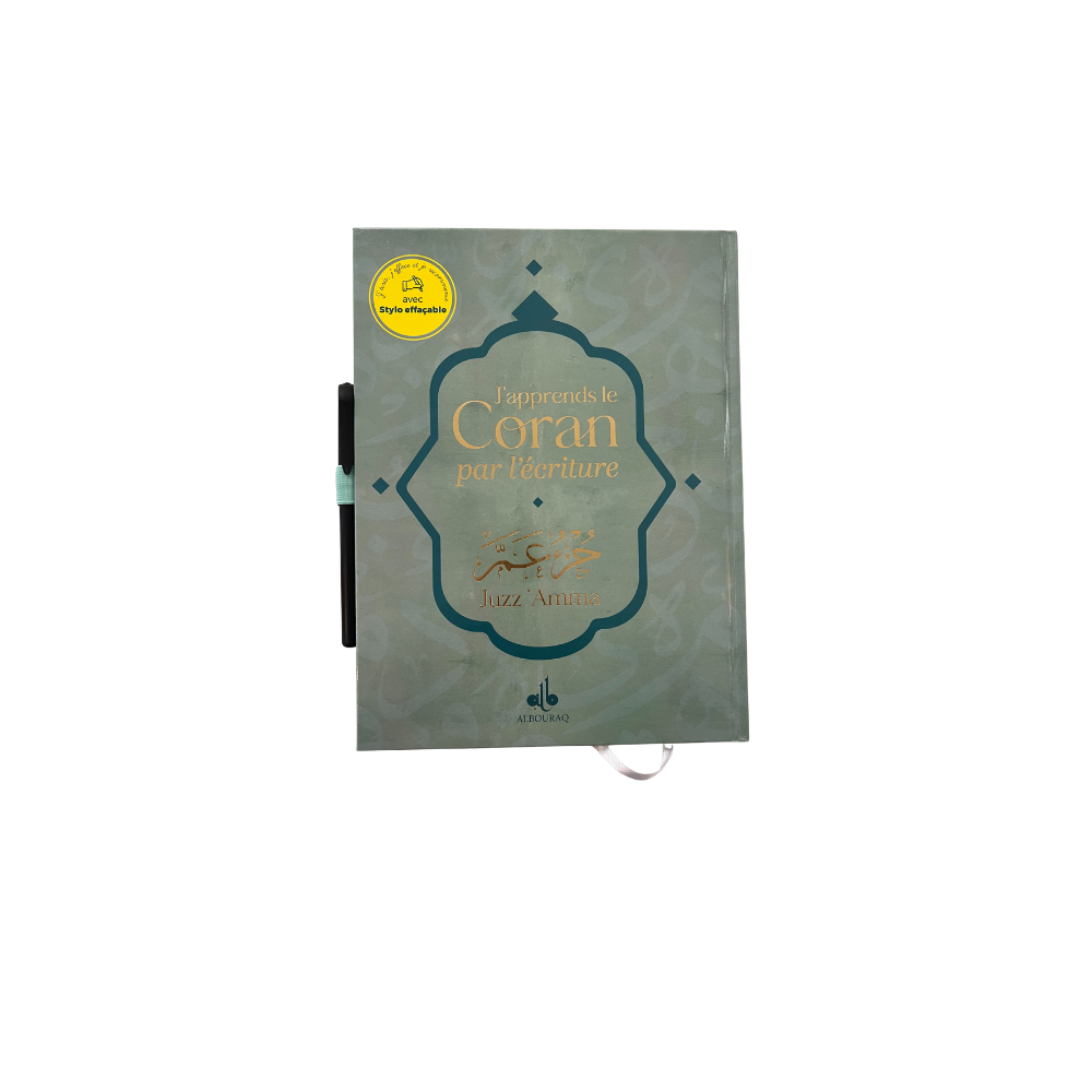 Une première partie avec le Juzz ‘Amma préécrit, permettant à l’apprenant de repasser et copier les versets afin de se familiariser avec l’écriture arabe.