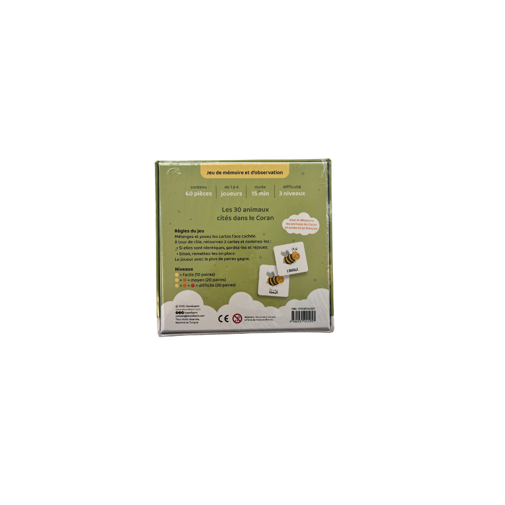 Le Mémo des animaux du Coran est un jeu éducatif conçu pour initier les enfants, dès le plus jeune âge, aux animaux mentionnés dans le Coran.