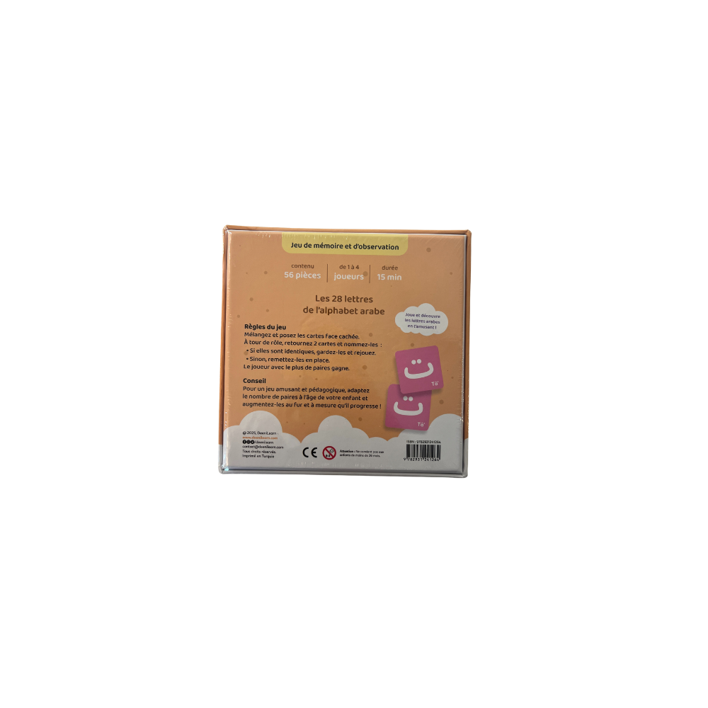 Un jeu ludique pour découvrir l’alphabet arabe tout en s’amusant !Ce coffret contient 56 cartes solides, adaptées aux petites mains. Idéal pour développer la mémoire, la concentration et apprendre les lettres arabes de façon amusante.